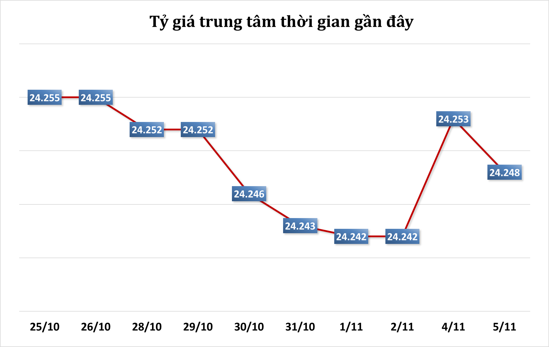 Ngân hàng Nhà nước sáng nay niêm yết tỷ giá trung tâm ở mức 24.248 đồng, giảm 5 đồng so với phiên trước.