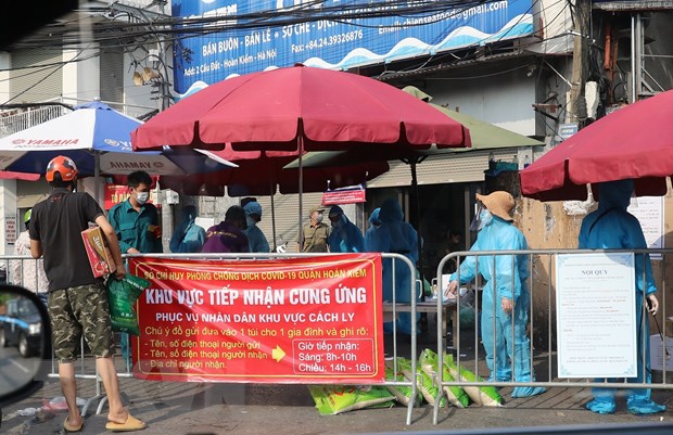 Điểm tiếp nhận hàng hoá cho khu vực cách ly y tế phòng, chống COVID-19 phường Chương Dương, Hà Nội. (Ảnh: TTXVN)