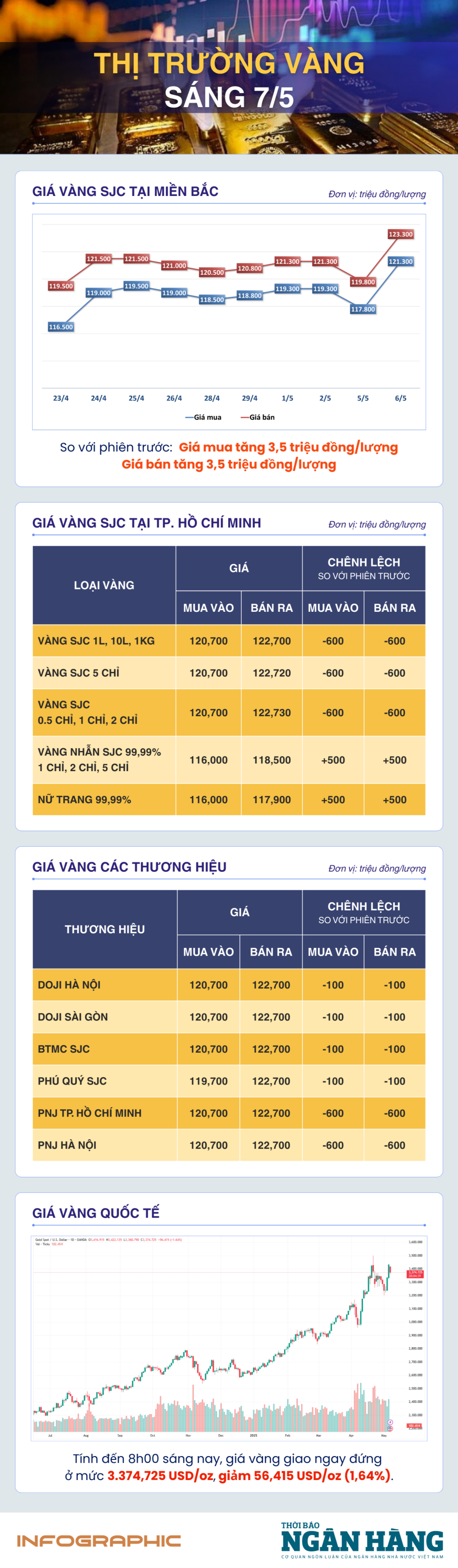 Giá vàng giảm nhanh trong sáng nay sau khi tăng mạnh lên trên 3.400 USD/oz trong phiên 6/5. Diễn biến tăng này do thị trường ghi nhận lực mua trở lại từ nhà đầu tư Trung Quốc sau kỳ nghỉ lễ dài và gia tăng lo ngại về chính sách thuế quan mới từ chính quyền Tổng thống Trump. Đồng thời, giới đầu tư toàn cầu cũng đang chờ đợi tín hiệu định hướng từ cuộc họp chính sách tiền tệ của Cục Dự trữ Liên bang Mỹ (Fed), dự kiến kết thúc vào ngày thứ Tư.