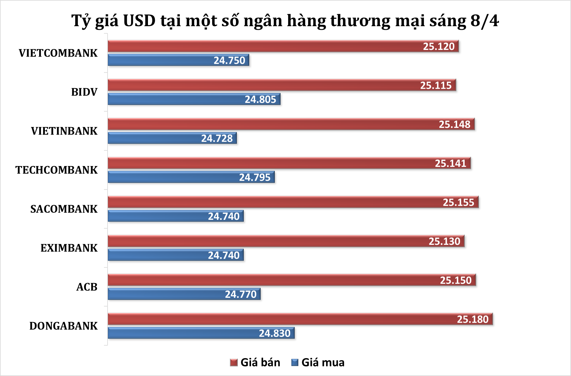Cụ thể, tính đến 9h sáng nay, giá mua USD thấp nhất đang ở mức 24.728 VND/USD (cao hơn 33 đồng), giá mua cao nhất đang ở mức 24.830 VND/USD (cao hơn 30 đồng). Ở chiều bán ra, giá bán thấp nhất đang ở mức 25.115 VND/USD (cao hơn 20 đồng), giá bán cao nhất đang ở mức 25.180 VND/USD (cao hơn 30 đồng).
