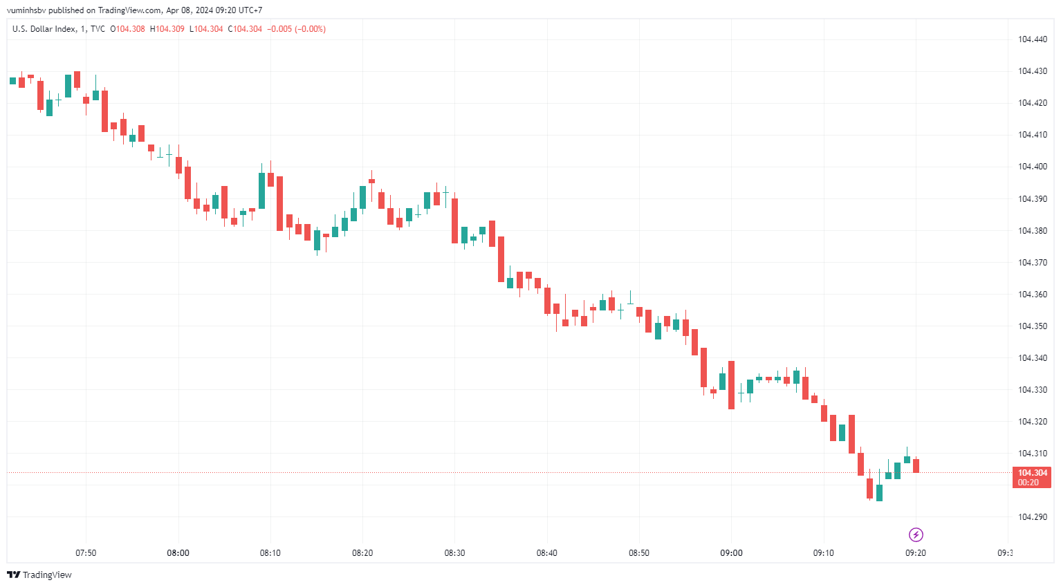 Chỉ số đô la Mỹ (DXY), đo lường biến động của bạc xanh so với 6 đồng tiền chủ chốt (EUR, JPY, GBP, CAD, SEK, CHF), hiện ở mức 104,304 điểm, tăng 0,114 điểm so với thời điểm mở cửa.