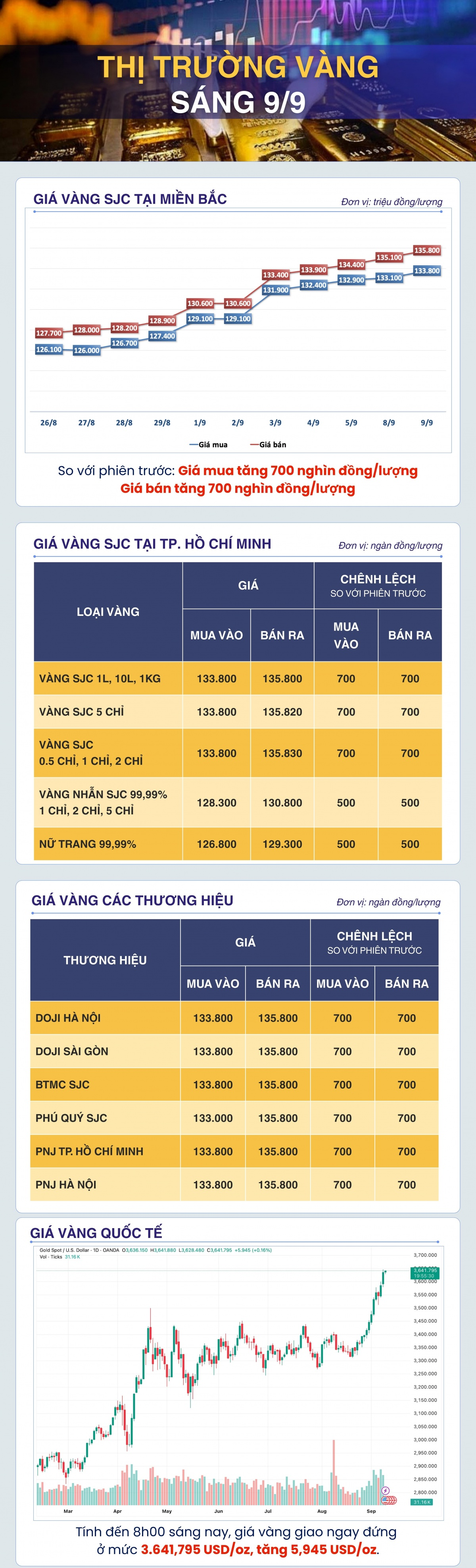 Kết thúc phiên giao dịch ngày 8/9, giá vàng giao ngay tăng 1,2% lên 3.632,51 USD/oz. Trong khi đó, giá vàng tương lai cộng 0,7% lên 3.680,30 USD/oz.
