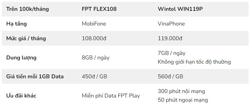 FPT và Wintel là hai nhà mạng ảo hiếm hoi cung cấp gói cước Data với giá trên 100.000 đồng/tháng. Đây là điều dễ hiểu vì lượng người dùng của phân khúc này không quá nhiều, chủ yếu là khách hàng doanh nghiệp hoặc những ai dùng Data với cường độ cao. FPT FLEX108 nổi bật khi có giá rẻ hơn trong khi dung lượng tốc độ cao lại lớn hơn. Đổi lại, Wintel WIN119P lại không giới hạn Data tốc độ thường, ngoài ra còn miễn phí tới 50 phút gọi ngoại mạng mỗi tháng.