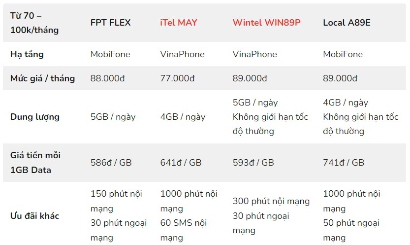 Các gói cước từ 70.000-100.000 đồng/tháng