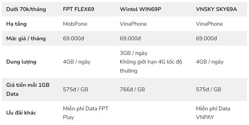 Phân khúc dưới 70.000 đồng/tháng chứng kiến sự xuất hiện của rất nhiều gói cước khác nhau, nổi bật hơn cả là FLEX69, WIN69P cùng SKY69A. Điểm chung của cả ba gói cước này đến từ dung lượng Data khá lớn, đủ dùng với hầu hết đối tượng khác nhau. Wintel có lợi thế hơn khi không giới hạn Data tốc độ thường, trong khi VNSKY và FPT lại miễn phí Data với các ứng dụng độc quyền.