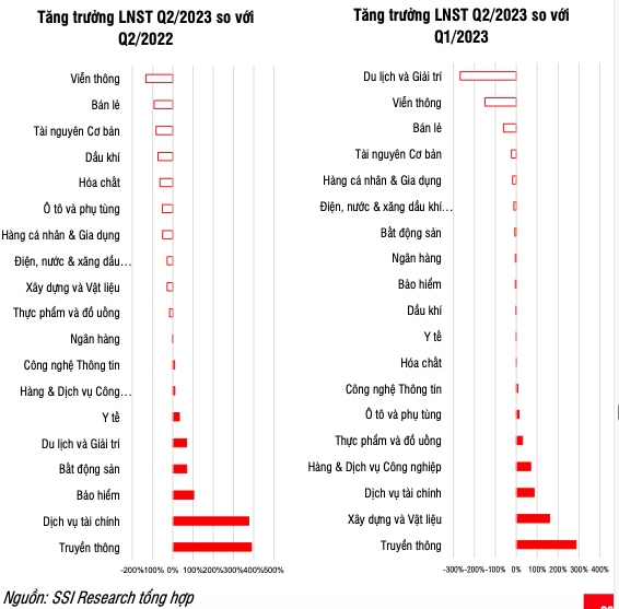 Theo SSI, điểm tích cực là mặt bằng lợi nhuận đã có dấu hiệu tạo đáy với lợi nhuận sau thuế phục hồi đáng kể so với mức đáy của Q4/2022 và tăng nhẹ 2,7% so với Q1/2023. Điểm sáng về lợi nhuận bắt đầu được ghi nhận ở một số ngành: Ngành Dịch vụ tài chính phục hồi mạnh mẽ với mức tăng +388% so với cùng kỳ và +85% so với Q1/2023, hầu hết các doanh nghiệp trong ngành đã có lãi trở lại nhờ thị trường chứng khoán phục hồi khi VN-Index tăng 5,2% trong Q2/2023 và giá trị giao dịch trung bình của thị trường tăng 39% so với quý trước. Biên lợi nhuận ròng của ngành cũng tăng mạnh từ 6,3% trong Q2/2022 lên 31,7% trong Q2/2023.