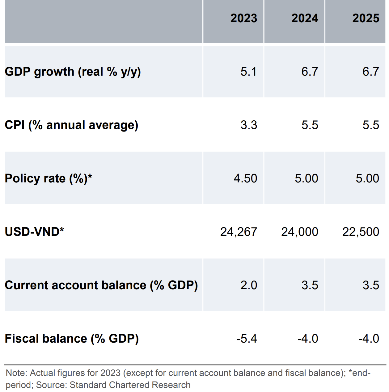 Với lo ngại lạm phát quay trở lại, lạm phát được dự báo tặng từ mức 3,3% năm 2023 lên 5,5% vào năm 2024. Standard Chartered cũng dự báo việc nới lỏng tiền tệ có thể sắp kết thúc do kinh tế Việt Nam đang trên đà phục hồi. Ngân hàng kỳ vọng lãi suất sẽ giữ nguyên mặc dù việc cắt giảm lãi suất vẫn có thể xảy ra. Lãi suất tái cấp vốn dự kiến sẽ duy trì ở mức 4,5% cho đến cuối quý 3, trước khi tăng 50 điểm cơ bản trong quý 4 năm 2024.
