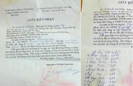 Tại đây, Công ty TNHH Trinh Anh có giấy biên nhận ghi rõ: "Thời gian nhận sổ là một tháng kể từ ngày ký. Sau một tháng không xin được vốn hỗ trợ đầu tư trồng rừng và cải tạo môi trường, chúng tôi xin hoàn trả lại giấy tờ và hồ sơ công chứng. Nếu công ty không thực hiện đúng bản cam kết thì chúng tôi sẽ chịu hoàn toàn trách nhiệm trước pháp luật".