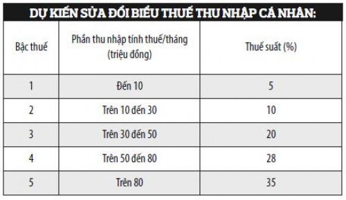 Biểu thuế lũy tiến từng phần đối với cá nhân có thu nhập từ tiền lương, tiền công cũng được sửa đổi vì biểu thuế hiện hành là không hợp lý, quá nhiều bậc, giãn cách ở các bậc thấp quá hẹp dễ dẫn đến nhảy bậc thuế khi tổng hợp thu nhập vào cuối năm, làm tăng số thuế phải nộp, số lượng phải quyết toán thuế tăng một cách không cần thiết trong khi số thuế phải nộp thêm không nhiều; Thu nhập tính thuế ở từng bậc theo số lẻ dẫn đến khó nhớ, người nộp thuế khó khăn trong việc tự xác định số thuế phải nộp. Vì vậy sửa đổi biểu thuế này theo hướng: Giảm số bậc thuế chỉ còn 5 bậc và nới rộng khoảng cách ở các bậc thấp và điều chỉnh thu nhập tính thuế ở từng bậc theo số chẵn.