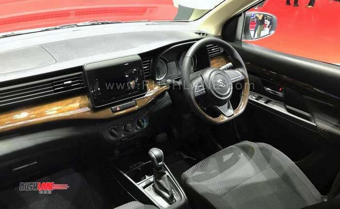 Nội thất Suzuki Ertiga 2019 có tông màu xám, đi kèm là các chi tiết bằng gỗ trên bảng điều khiển, cửa ra vào và vô lăng (chỉ có ở bản cao cấp nhất). Xe được trang bị hệ thống thông tin giải trí với màn hình cảm ứng SmartPlay 6,75 inch hỗ trợ Apple CarPlay và Android Auto. Ngoài ra còn có cổng sạc 12V cho ghế trước/sau, đầu cắm USB và audio, 4 loa, cảm biến lùi, nút bấm khởi động, hỗ trợ giữ làn, cân bằng điện tử (trên bản cao cấp).