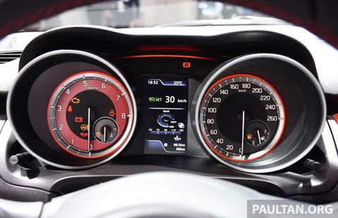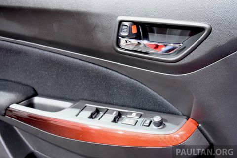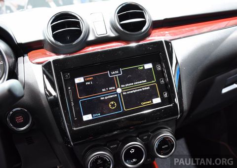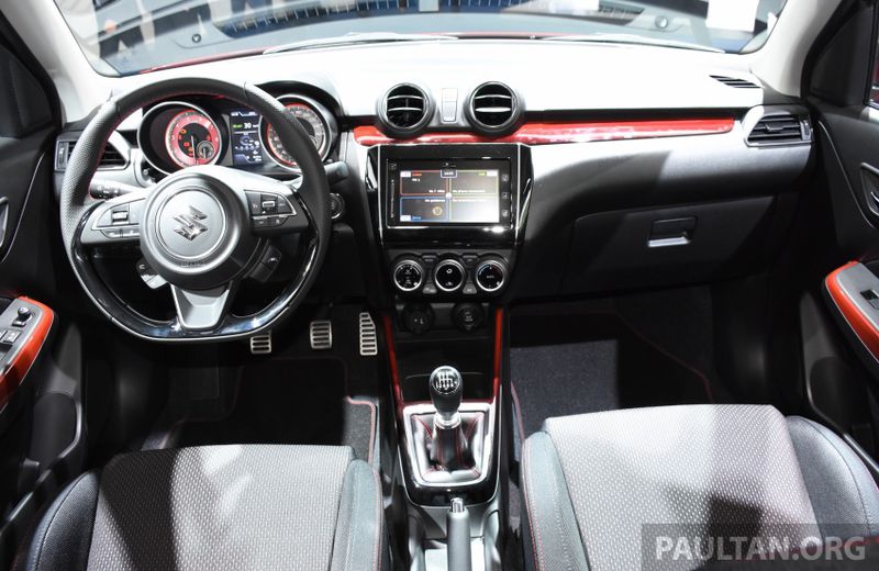Nội thất xe được trang trí "tor sur tor" với bề ngoài bằng các đường chỉ thêu đỏ trên ghế, ốp carbon đỏ trên bảng tablo, bệ tỳ tay cùng logo Sport đỏ. Suzuki trang bị cho Swfit vô lăng đáy phẳng bọc da, cụm đồng hồ hiển thị thông số mạ chrome và bàn đạp làm bằng hợp kim. Với hệ thống giải trí, khách hàng sẽ có một mà hình cảm ứng 7inch kết nối điện thoại thông minh.
