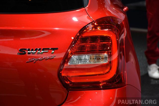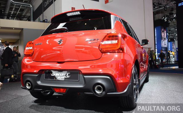 Phía sau, xe nổi bật với cụm đèn hậu LED tạo hình chữ C sắc xảo, cản gầm tối màu tích hợp hai ống xả đặt đối xứng và đuôi lướt gió kết hợp đèn phanh trên cao. Điểm nhấn cho phần thân xe là bộ mâm hợp kim 17inch thiết kế hình nan hoa mới. Đặc biệt, Suzuki cung cấp tới 7 tùy chọn màu sắc ngoại thất cho Swift Sport.