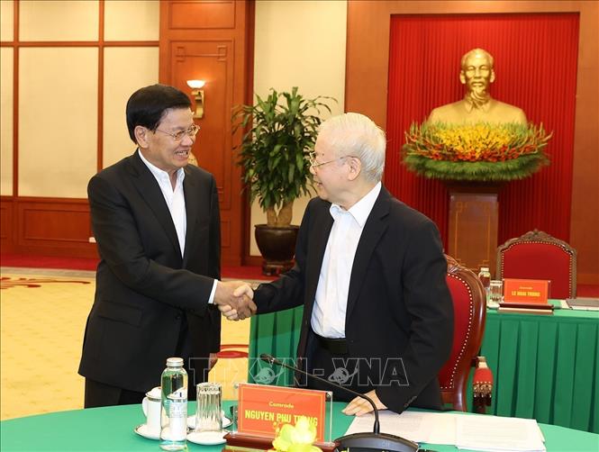 | Tổng Bí thư Nguyễn Phú Trọng đón Tổng Bí thư, Chủ tịch nước Lào Thongloun Sisoulith - Ảnh: TTXVN |