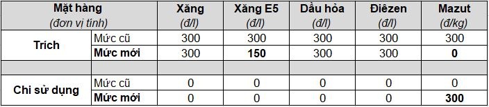 Cơ quan điều hành cũng điều chỉnh mức trích lập vào Quỹ bình ổn với xăng E5 RON 92 và dầu mazut, lần lượt giảm về 150 đồng/lít và 0 đồng/kg. Các mặt hàng còn lại như xăng RON 95-III, dầu diesel và dầu hoả vẫn giữ mức trích lập vào quỹ 300 đồng/lít như cách đây 10 ngày.