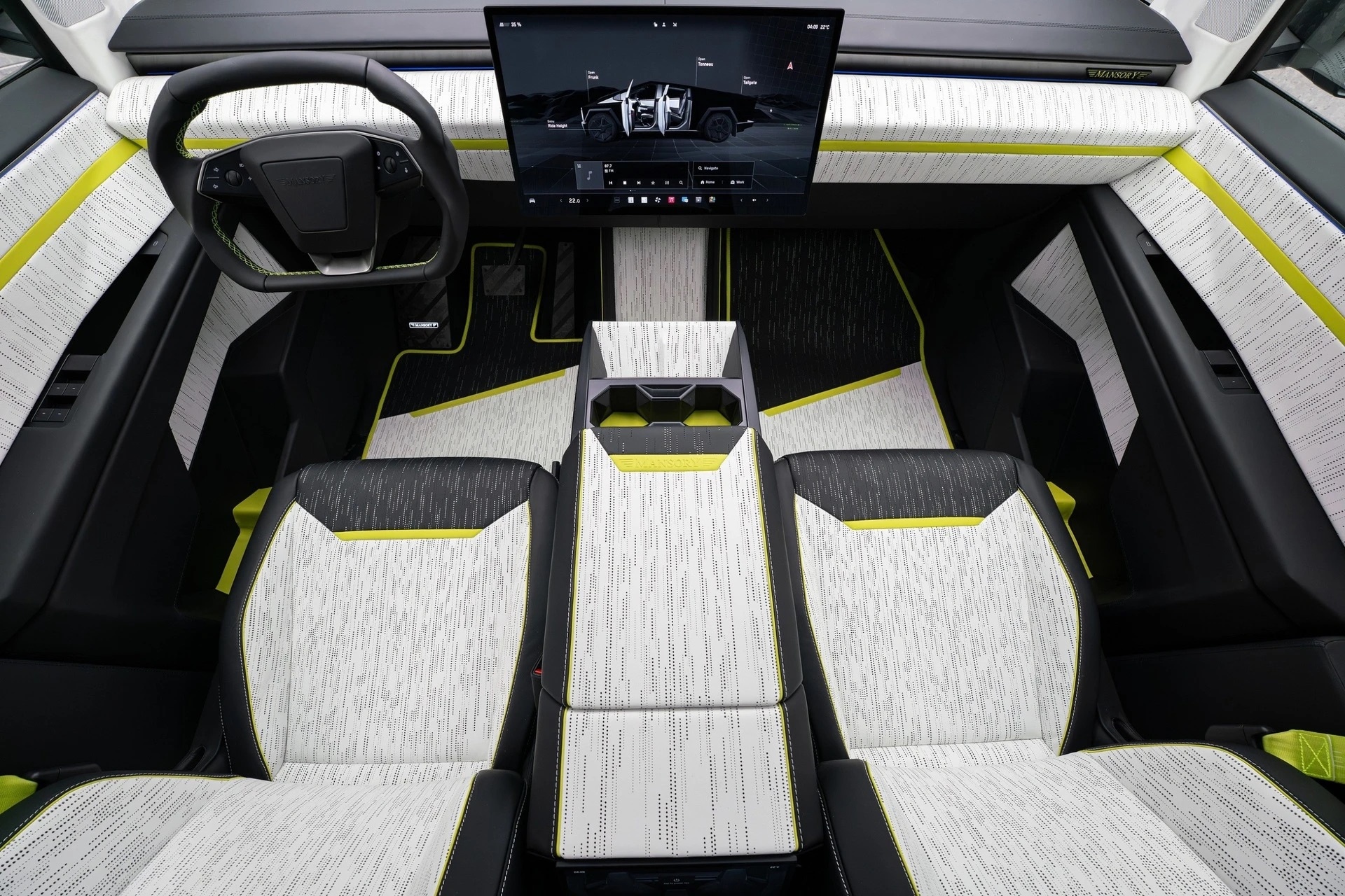 Khoang nội thất của Cybertruck Elongation được hoàn thiện bằng da và sợi carbon cao cấp, tùy chỉnh theo yêu cầu khách hàng. Các bề mặt bóng bẩy hoặc chi tiết carbon kết hợp ghế da tương phản, cùng bảng táp-lô và táp-pi cửa thiết kế riêng, mang lại không gian cabin sang trọng. Logo Mansory được thêu tinh tế trên tựa đầu ghế, dây đai an toàn và thảm sàn, tạo điểm nhấn độc đáo.