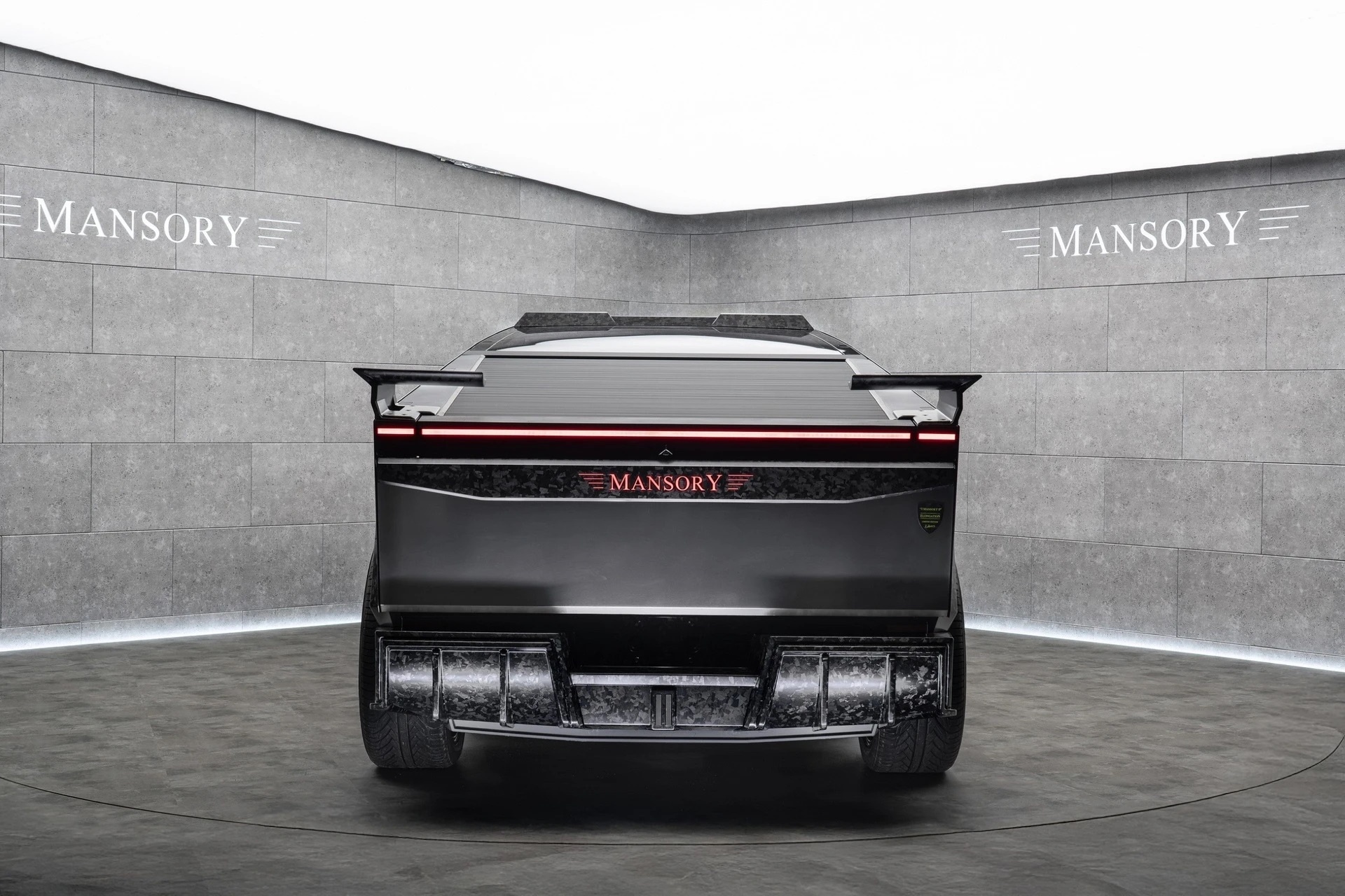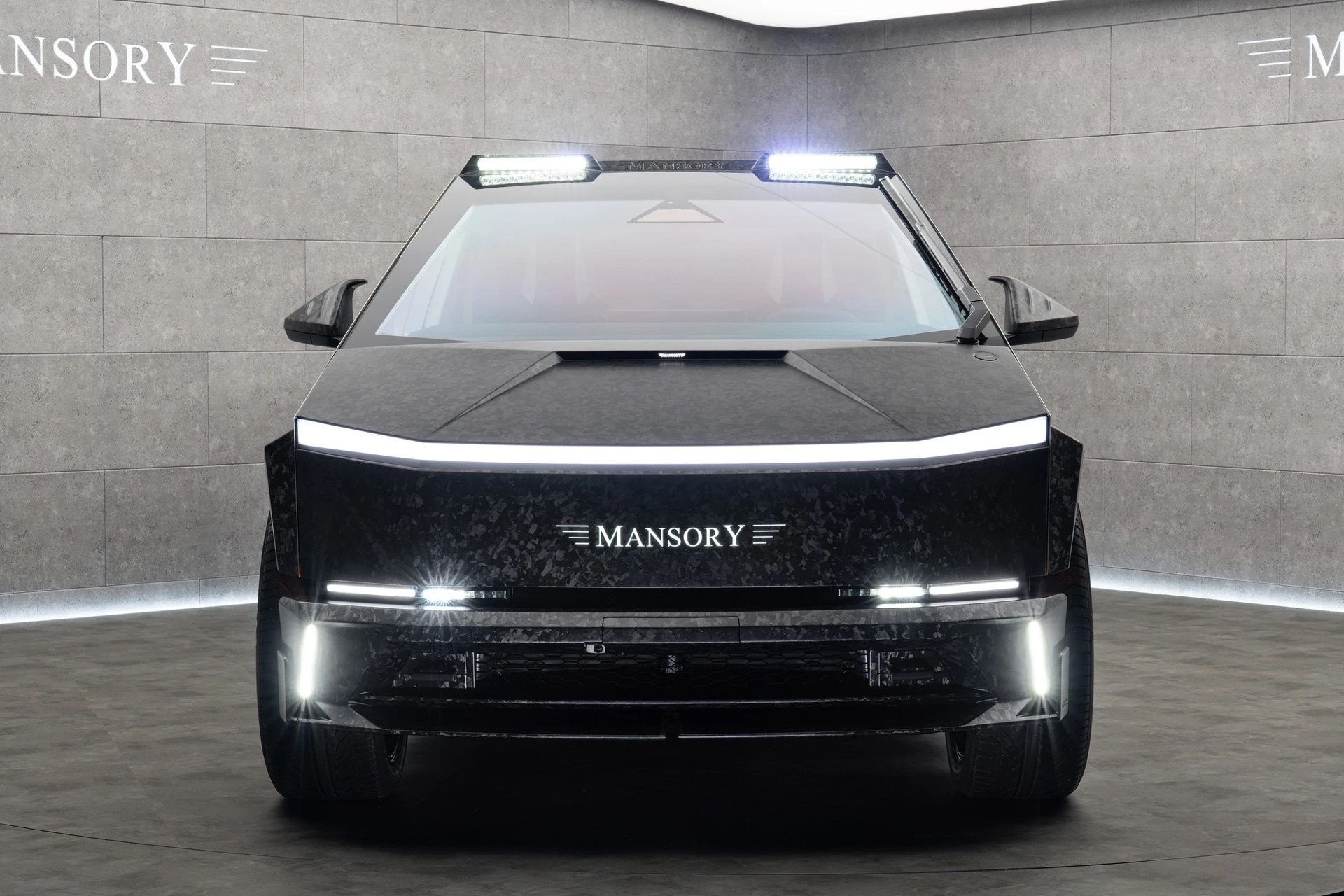 So với phiên bản gốc, Cybertruck Elongation được Mansory trang bị lớp ốp carbon đúc bao phủ toàn bộ nắp ca-pô và mặt trước, tạo vẻ ngoài mạnh mẽ. Hệ thống đèn chiếu sáng bổ sung trên cản trước và nóc xe càng tăng thêm nét hầm hố. Các viền vòm bánh xe cũng được ốp carbon đúc, mang dấu ấn đặc trưng của Mansory.