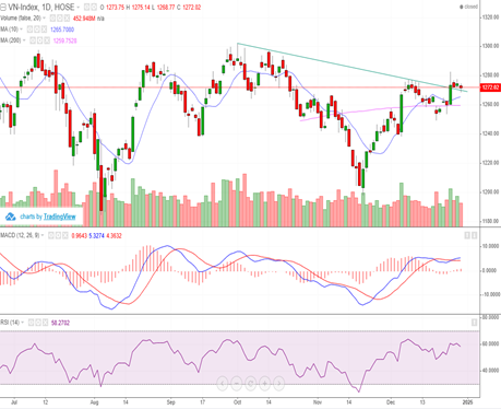 Về kỹ thuật, VN-Index xuất hiện hình thái nến với sự thận trọng của cả bên mua và bên bán. Chỉ số đang gặp vùng kháng cự gần nhất 1.280 điểm và có thể chịu áp lực rung lắc điều chỉnh, tích lũy trước khi cho xu hướng rõ ràng hơn. Nếu lực cầu được cải thiện, chỉ số có thể vượt qua vùng 1.280 điểm để hướng tới mốc 1.300 điểm. Nhà đầu tư có thể duy trì tỷ trọng cổ phiếu sẵn có trong danh mục.