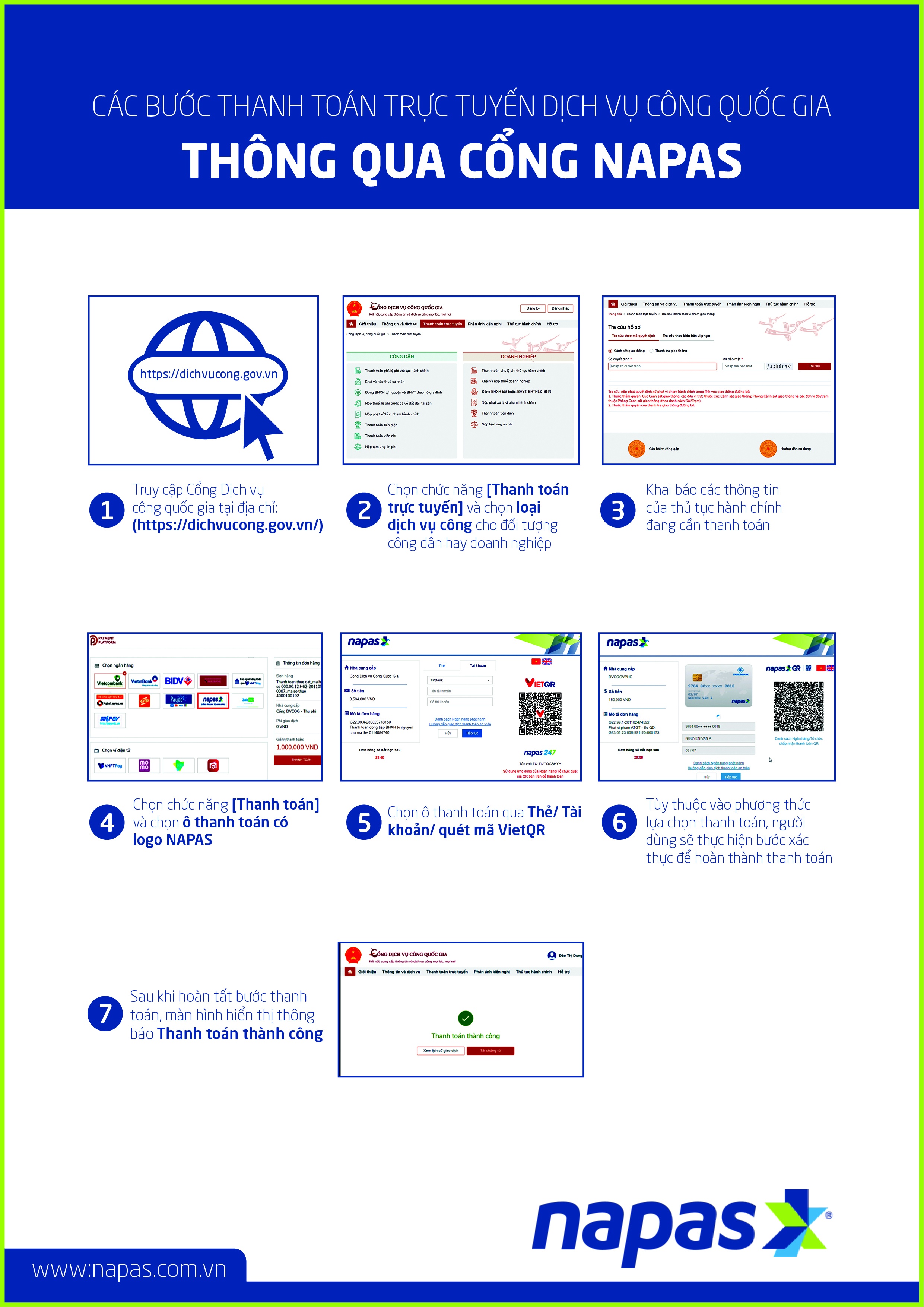 Hiện nay, NAPAS đã hoàn thành kết nối hạ tầng thanh toán tới 54 địa phương, 17 đơn vị là các Bộ/Cục/cơ quan để cung cấp dịch vụ thanh toán trực tuyến cho 06 nhóm dịch vụ trên Cổng Dịch vụ công quốc gia gồm: Thanh toán phí, lệ phí thủ tục hành chính; Nộp thuế cá nhân; Nộp bảo hiểm xã hội; Nộp thuế, lệ phí trước bạ về đất đai; Nộp phạt xử lý vi phạm hành chính; Nộp tạm ứng án phí.