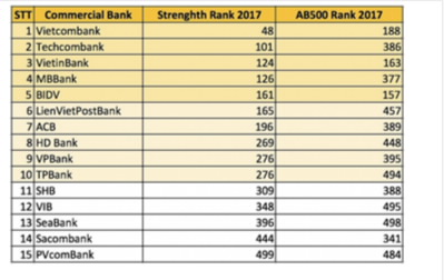Thứ nhất là danh sách 500 ngân hàng hàng đầu trong khu vực theo quy mô tài sản (AB500 Rank) và thứ hai là xếp loại 500 ngân hàng dựa trên niềm tin về khả năng sinh lời lâu dài từ kinh doanh cốt lõi của các ngân hàng (Strength Rank) hay các ngân hàng mạnh nhất khu vực.
