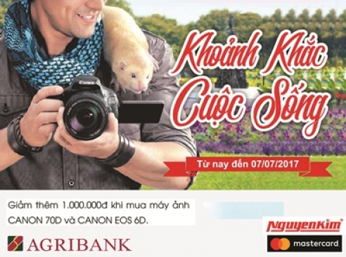 Cụ thể, từ nay đến hết ngày 07/7/2017, khách hàng là chủ thẻ Agribank Mastercard được giảm ngay thêm 1.000.000 VND khi mua máy ảnh CANON 70D body và CANON EOS 6D tại STĐM Nguyễn Kim. Ưu đãi áp dụng cho khách hàng mua lẻ mua hàng trực tiếp tại các STĐM Nguyễn Kim; không áp dụng cho khách hàng là các tổ chức/công ty.