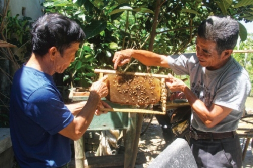 Ông Nguyễn Thanh Liêm (bên phải), xóm Quang Trung, xã Long Thành, huyện Yên Thành chia sẻ với cán bộ tổ chức hội đoàn thể về kinh nghiệm nuôi ong lấy mật từ vốn vay 30 triệu đồng chương trình hộ nghèo của NHCSXH .