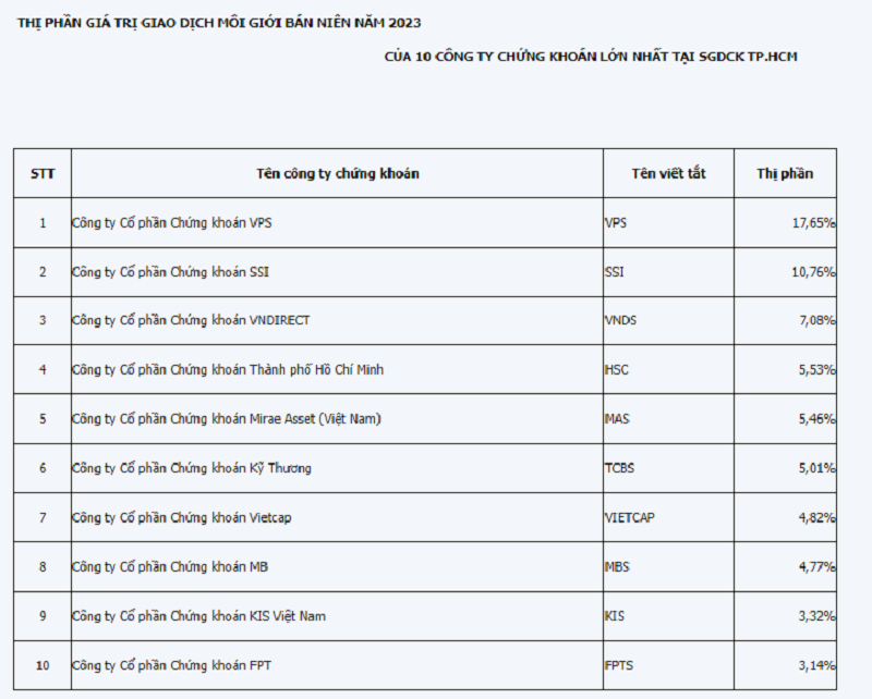 6 tháng đầu năm 2023, Chứng khoán VPS dẫn đầu danh sách 10 công ty chứng khoán có thị phần môi giới lớn nhất sàn HoSE, với tổng thị phần 17,65%. Chứng khoán SSI chiếm 10,76% thị phần và đứng ở vị trí số 2.