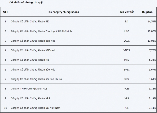 Đối với cổ phiếu và chứng chỉ quỹ, Công ty cổ phần Chứng khoán SSI chiếm thị phần lớn nhất với 14,54%; tiếp theo là Công ty cổ phần Chứng khoán TP.HCM (HSC) chiếm 10,82%; Công ty cổ phần Chứng khoán Bản Việt (VCSC) chiếm 10,05%; Công ty cổ phần Chứng khoán VNDIRECT (VNDS) chiếm 7,75%…
