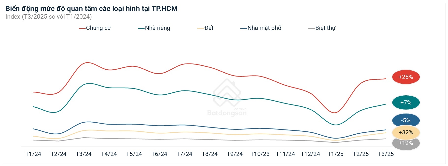 Theo dữ liệu Toàn cảnh thị trường chung cư TP. Hồ Chí Minh do nền tảng công nghệ Batdongsan.com.vn công bố vào tháng 4/2025, mức độ quan tâm đến phân khúc căn hộ tại TP. Hồ Chí Minh đã phục hồi tích cực sau Tết. Cụ thể, vào tháng 3/20225, nhu cầu tìm kiếm chung cư tăng 25% so với tháng 1/2024.