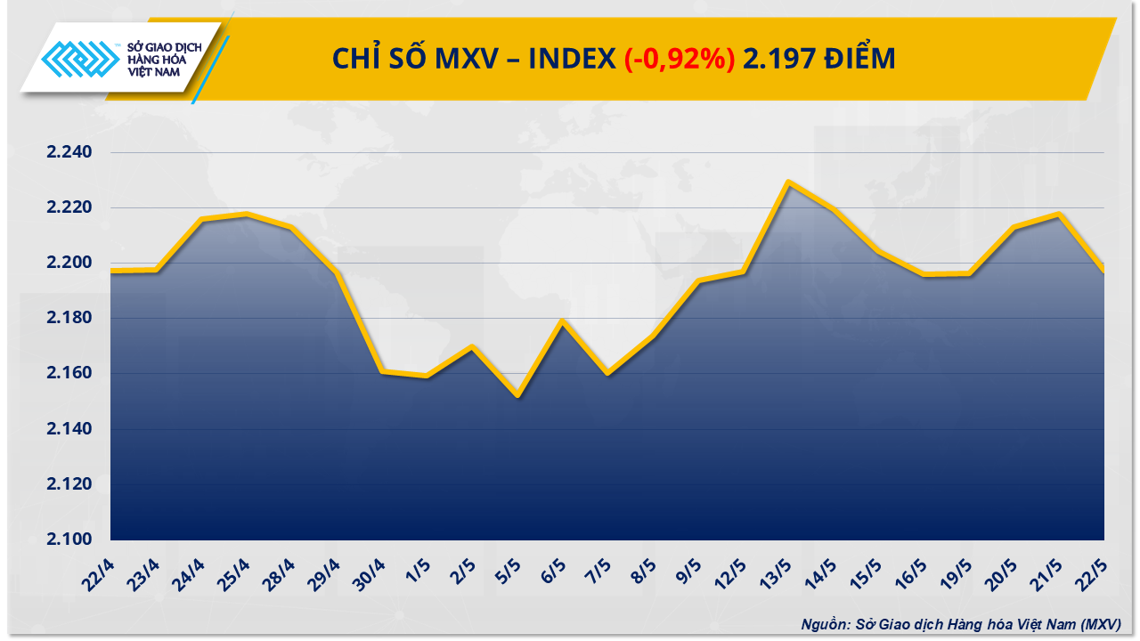 Đóng cửa, chỉ số MXV-Index giảm 0,92% về mức 2.197 điểm. Dẫn đầu đà giảm là nhóm nguyên liệu công nghiệp với 8 trên 9 mặt hàng đồng loạt giảm giá, trong đó chỉ sau một phiên hồi phục, hai mặt hàng đường quay lại đà suy yếu. Trên thị trường kim loại, giá kim loại quý cũng đi xuống.