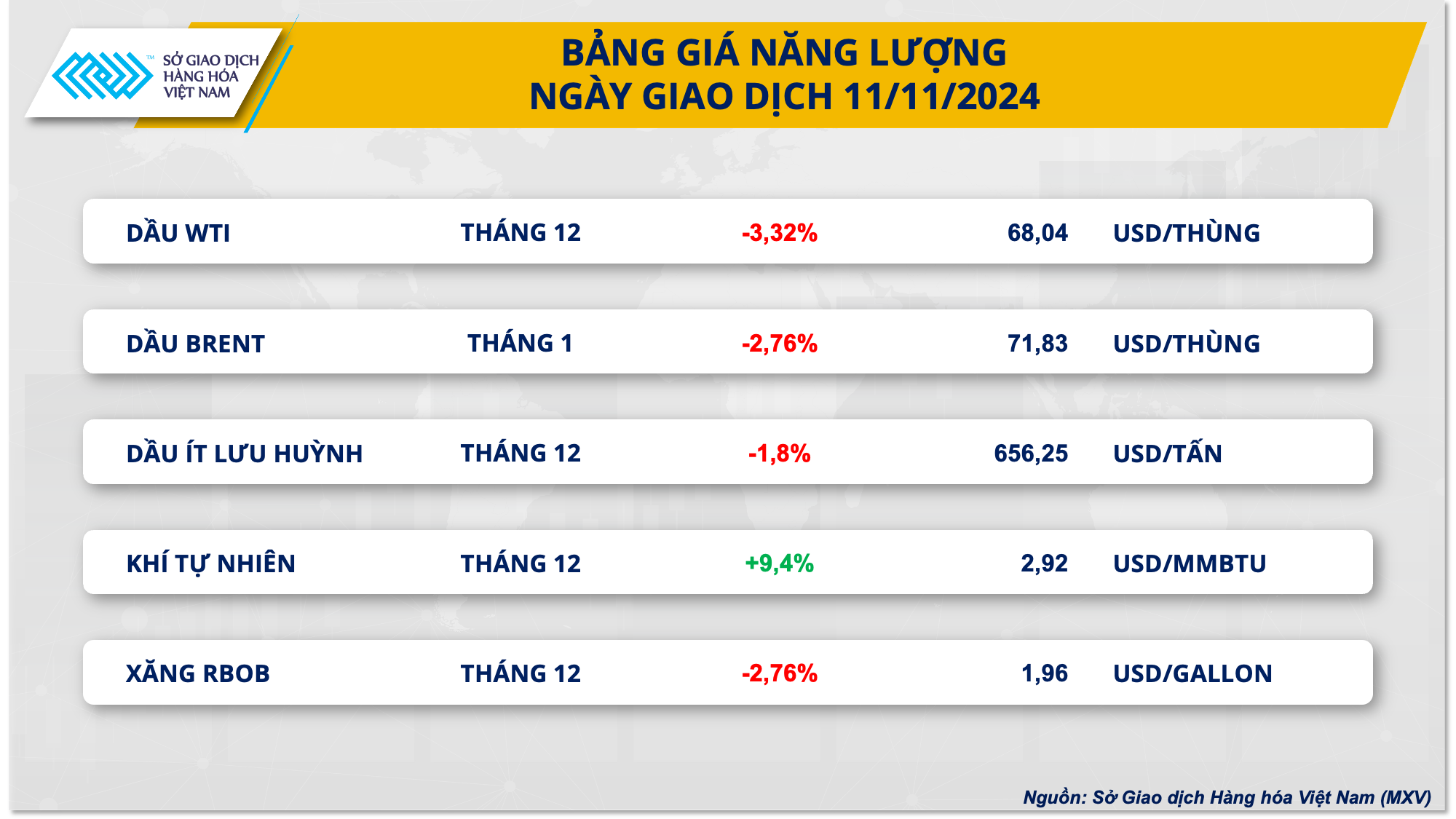 Chốt phiên giao dịch ngày 11/11, giá dầu thô WTI giảm 3,32% xuống còn 68,04 USD/thùng. Trong khi đó, giá dầu thô Brent giảm 2,76%, đạt 71,83 USD/thùng.