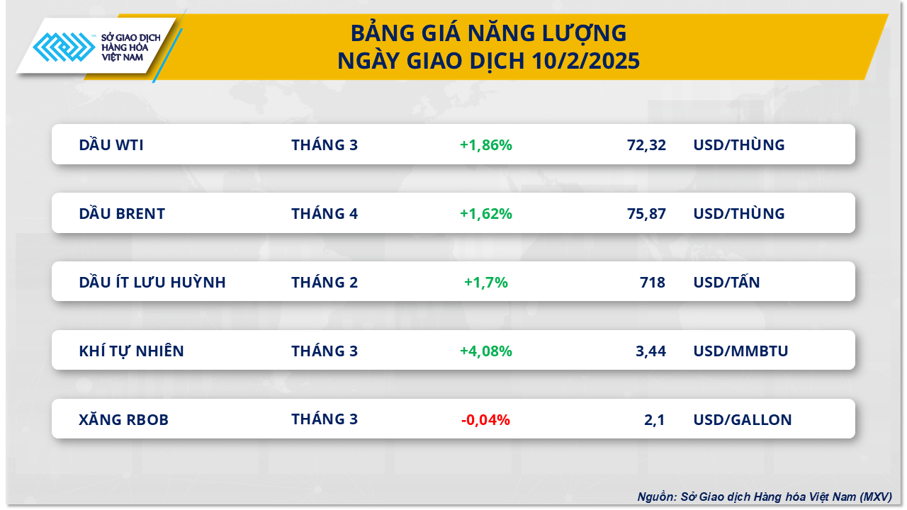Kết thúc phiên giao dịch ngày hôm qua, 4 trên 5 mặt hàng năng lượng đồng loạt tăng giá. Trong đó, giá dầu thế giới bật tăng trong phiên giao dịch ngày hôm qua (10/2) sau quyết định điều chỉnh giá của các nhà sản xuất Trung Đông. Theo ghi nhận, giá dầu tăng gần 2% lên mức 72,32 USD/thùng đối với dầu WTI và 75,87 USD/thùng đối với dầu Brent, chấm dứt chuỗi giảm giá kéo dài ba tuần liên tiếp. Động thái này cho thấy thị trường dầu mỏ đã phần nào bỏ qua những lo ngại về tác động từ tuyên bố áp thuế mới của Tổng thống Mỹ Donald Trump.