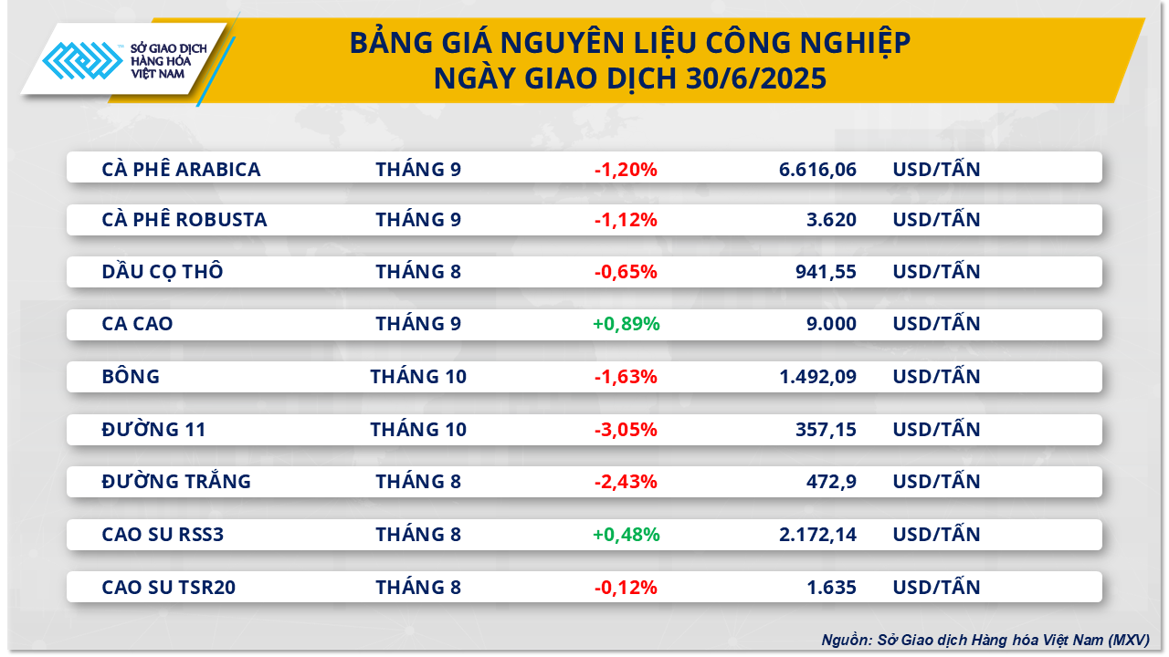 Theo MXV, thị trường nguyên liệu công nghiệp không thoát khỏi xu hướng chung khi 7 trên 9 mặt hàng đóng cửa trong sắc đỏ. Nổi bật trong đó là giá hai mặt hàng đường đồng loạt giảm mạnh. Cụ thể, giá đường thô 11 đã chạm mức thấp nhất trong vòng hơn 4 năm qua khi đánh mất 3,05% xuống mức 357 USD/tấn, trong khi giá đường trắng cũng ghi nhận mức giảm tới 2,43%, về mức 473 USD/tấn.