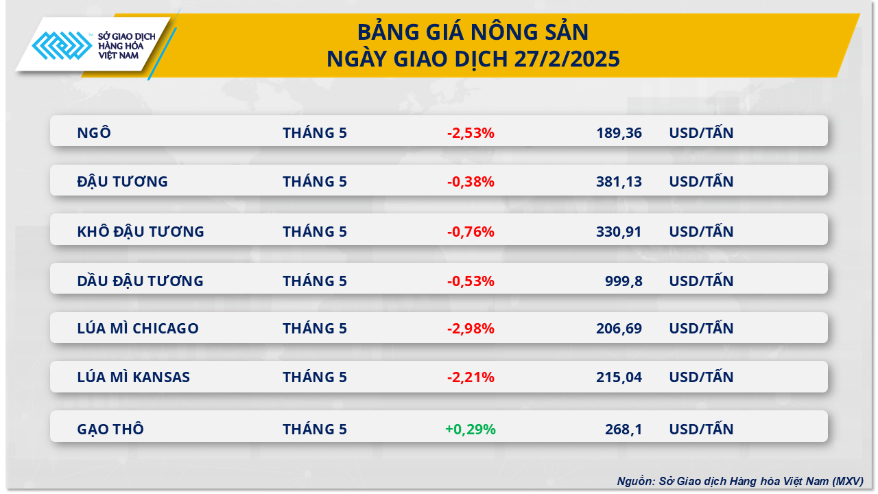 Theo MXV, sắc đỏ bao phủ thị trường nông sản trong phiên giao dịch hôm qua. Đáng chú ý, giá ngô giảm 2,5% về mức 189 USD/tấn vào hôm qua, ghi nhận phiên thứ 5 liên tiếp suy yếu. Thị trường hiện đang ở mức thấp nhất kể từ giữa tháng 1, trong bối cảnh các thông tin cơ bản mới đều gây sức ép lên giá.