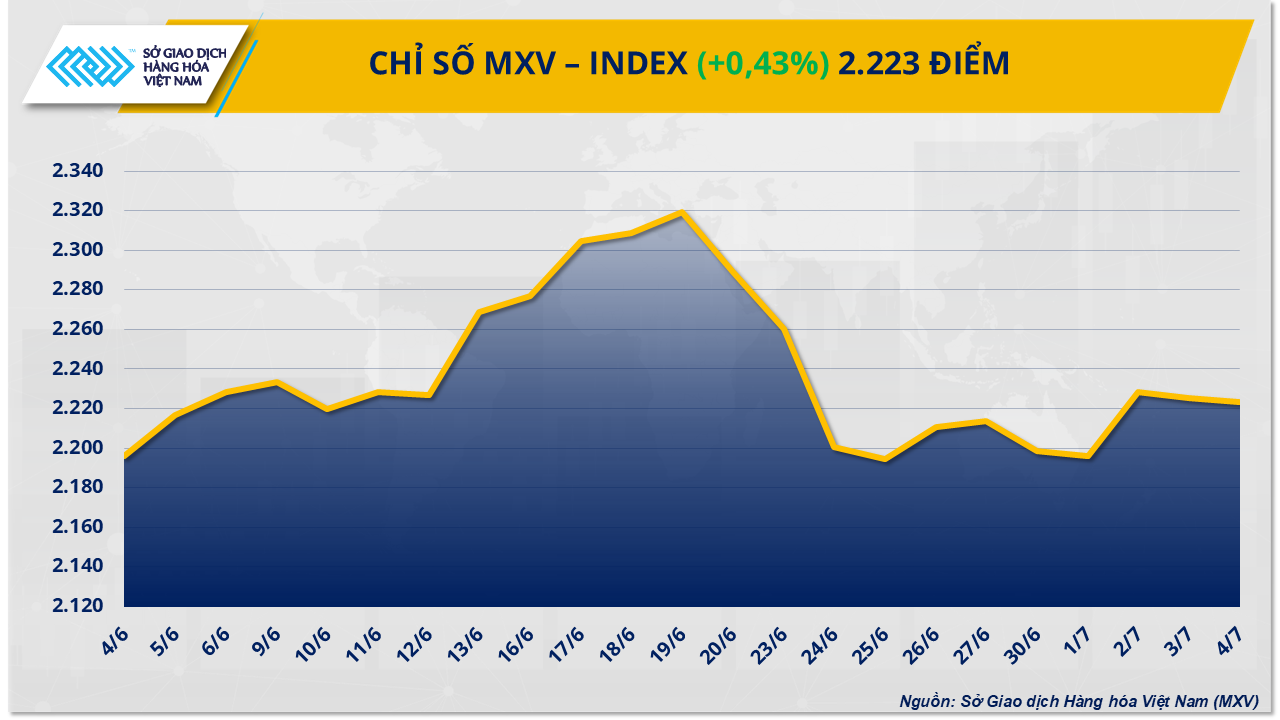 Đóng cửa, lực mua chiếm ưu thế đã hỗ trợ chỉ số MXV-Index tăng gần 0,5% lên mức 2.223 điểm. Trên thị trường năng lượng, giá dầu được hỗ trợ nhờ kỳ vọng kinh tế vĩ mô tích cực hỗ trợ nhu cầu tiêu thụ toàn cầu. Trong khi đó, thị trường cà phê ghi nhận xu hướng phân hóa rõ nét.