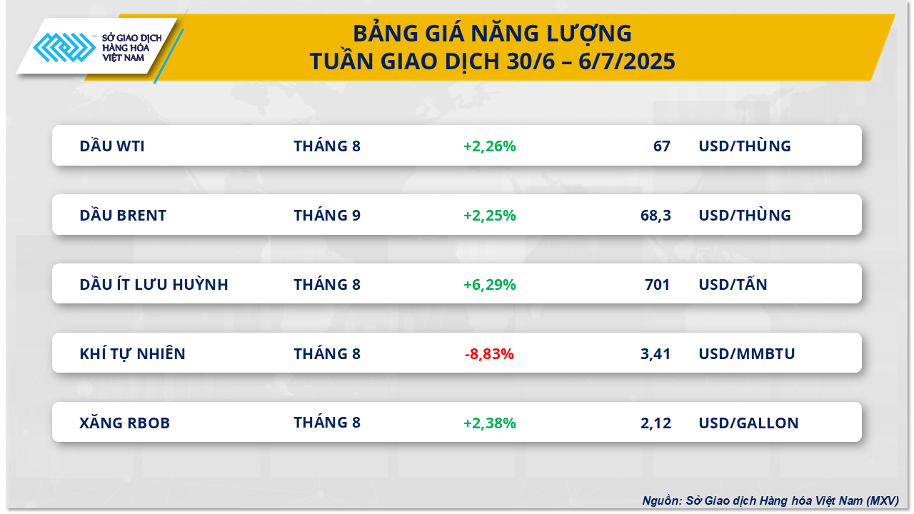 Theo ghi nhận của MXV, thị trường năng lượng đã quay đầu phục hồi tích cực trong tuần giao dịch vừa qua nhờ tâm lý lạc quan về triển vọng kinh tế vĩ mô sẽ thúc đẩy nhu cầu dầu toàn cầu. Trong đó, giá dầu Brent ghi nhận mức tăng 2,25%, lên mốc 68,3 USD/thùng. Tương tự, giá dầu WTI cũng tăng 2,26%, dừng ở mốc 67 USD/thùng.