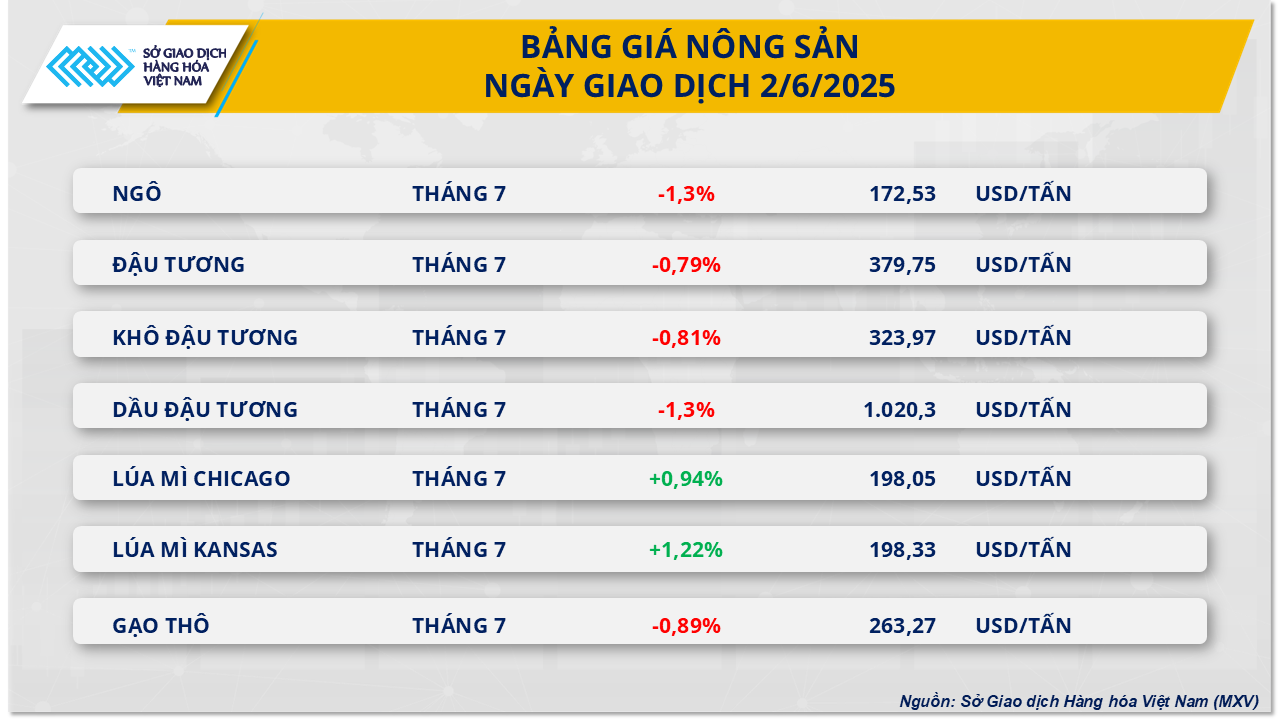 Theo ghi nhận của MXV, sắc đỏ chiếm ưu thế trên thị trường nông sản trong phiên giao dịch ngày hôm qua (2/6). Trong đó, giá đậu tương mở đầu tháng mới với sắc đỏ khi giảm 0,79% về mức 379 USD/tấn. Bên cạnh việc điều kiện thời tiết thuận lợi tại Mỹ, thị trường còn chịu những áp lực từ tín hiệu tiêu cực trong quan hệ thương mại Mỹ - Trung và sự suy yếu của giá dầu đậu tương.