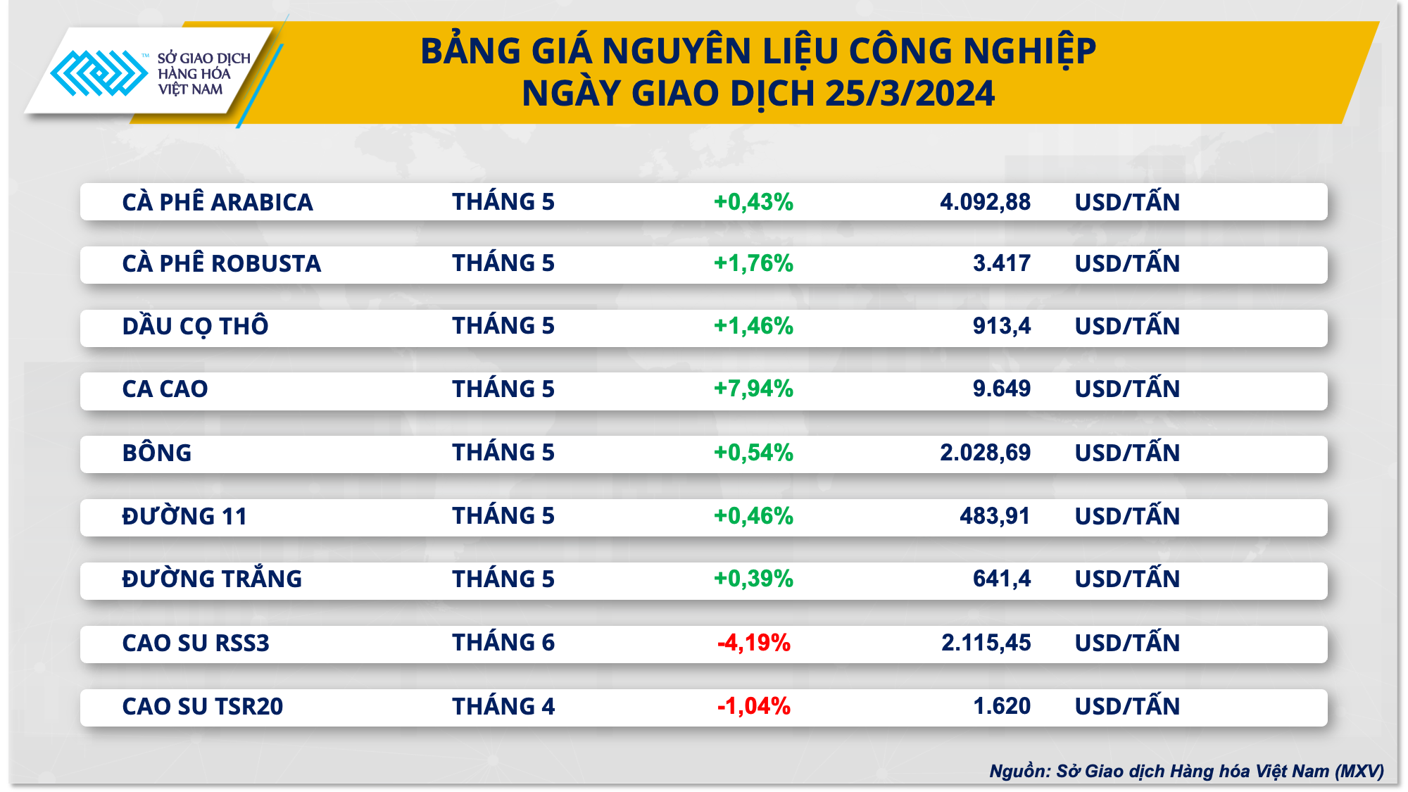 Theo MXV, khép lại phiên giao dịch 25/3, bảng giá nhóm nguyên liệu công nghiệp tràn ngập sắc xanh. Nổi bật, giá ca cao tạo đỉnh lịch sử mới khi bật tăng gần 8% trong phiên hôm qua. Thiếu hụt nguồn cung trầm trọng tại các nước sản xuất chính tiếp tục là yếu tố thúc đẩy giá.