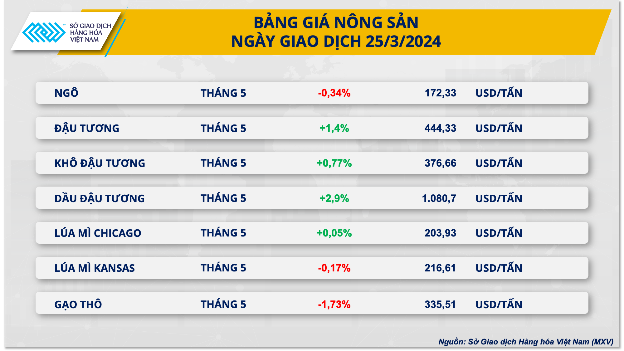 Giá đậu tương hợp đồng kỳ hạn tháng 5 tăng nhẹ. Mặc dù chịu một số áp lực bán khi mở cửa, tuy nhiên, phe mua đã nhanh chóng được đẩy mạnh ngay sau đó và duy trì thế áp đảo đến cuối phiên. Lo ngại về tình hình nguồn cung tại Brazil và triển vọng gieo trồng thấp hơn tại Mỹ là yếu tố chính nâng đỡ thị trường.