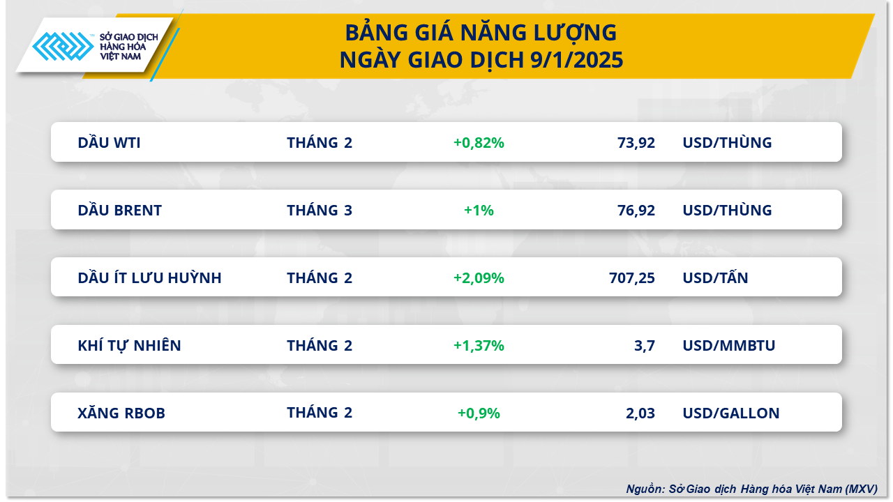 Kết phiên, giá dầu thô WTI tăng 0,82% lên 73,92 USD/thùng, trong khi dầu thô Brent tăng 1%, đạt 76,92 USD/thùng. Giá khí tự nhiên cũng tăng nhẹ 1,37% lên mức 3,7 USD/MMBtu.