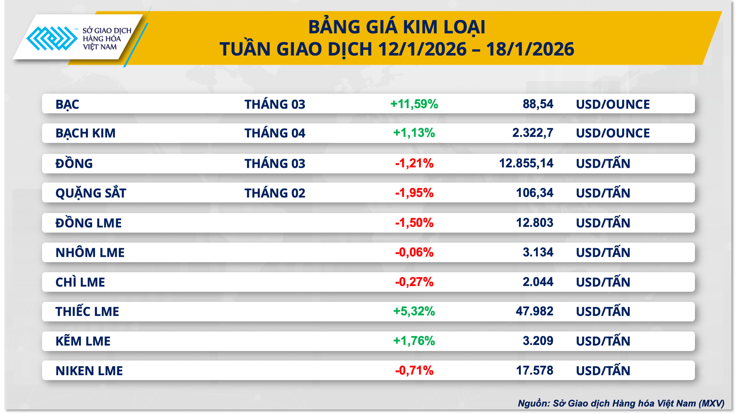 Khép lại tuần giao dịch vừa qua, thị trường kim loại ghi nhận sự phân hóa rõ nét giữa các mặt hàng trong nhóm. Trong đó, bạc trở thành tâm điểm khi duy trì đà tăng mạnh trong phần lớn thời gian của tuần. Giá bạc COMEX liên tiếp đi lên trong 4 phiên đầu tuần, vượt mốc 92 USD/oz trong phiên ngày 15/1 - mức cao nhất trong nhiều năm trở lại đây.