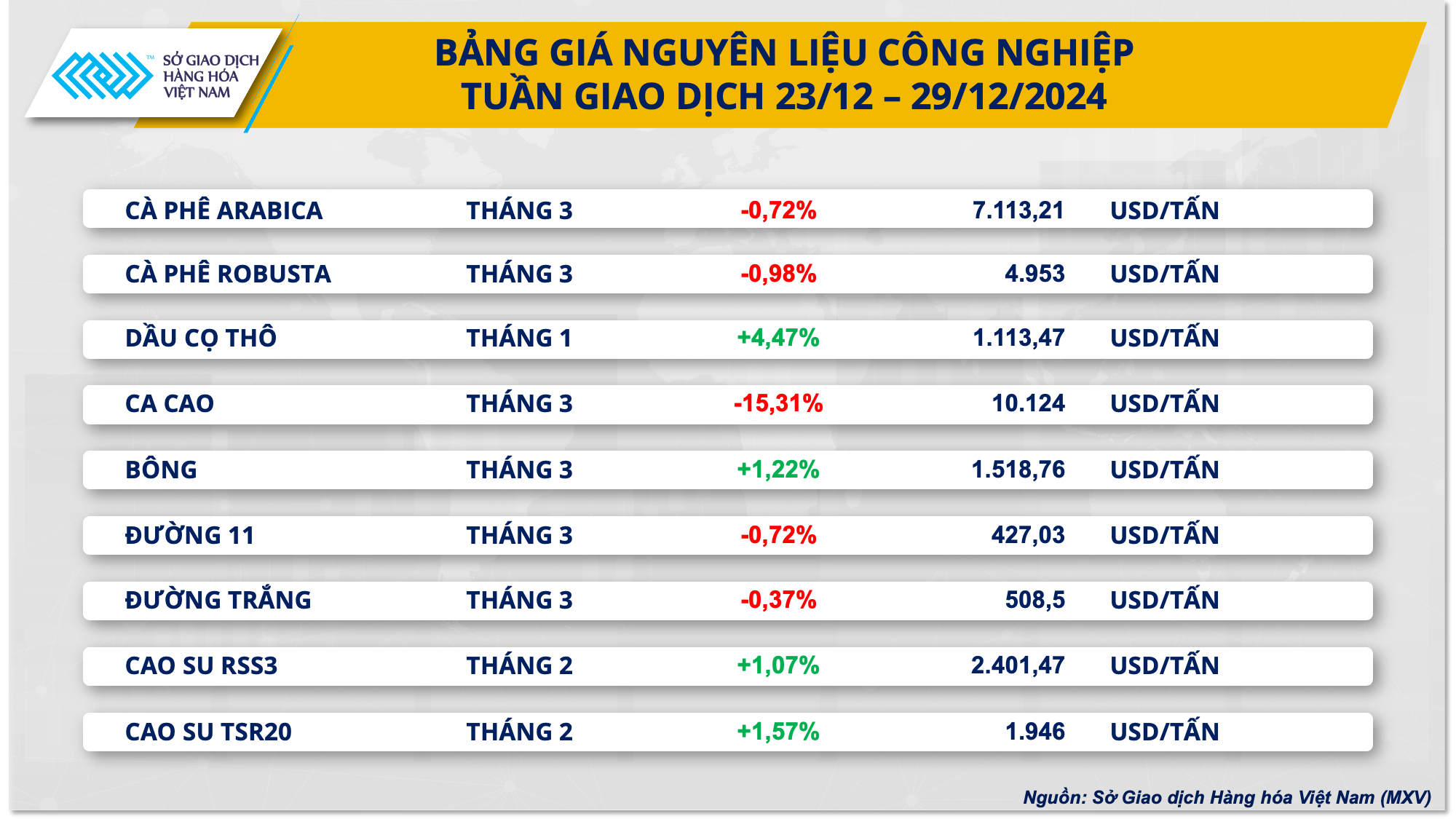 Bên cạnh đó, giá hai mặt hàng cà phê cũng suy yếu trong tuần qua khi cà phê Arabica giảm 0,72% và cà phê Robusta giảm 0,98%. Trong tuần qua, các nhà đầu tư bắt đầu thanh lý hợp đồng để chốt lời trước kỳ nghỉ lễ Tết dài vào cuối năm. Thêm vào đó, các thông tin về hoạt động xuất khẩu của Brazil và ước tính thặng dư thương mại cà phê toàn cầu tăng so với dự báo đã gây áp lực lên giá mặt hàng này.