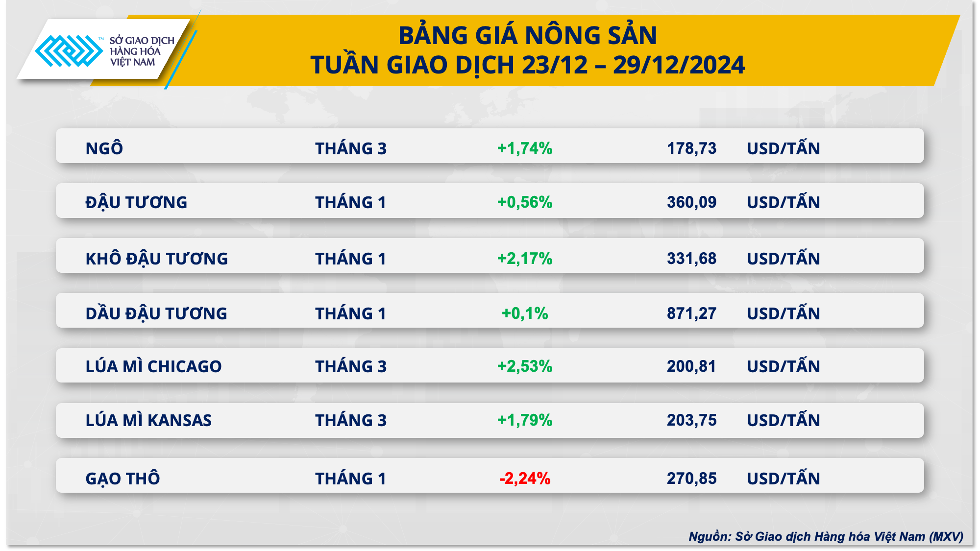 Bên cạnh đó, nhu cầu của thị trường nhìn chung vẫn tích cực. Trong báo cáo Export Inspections, Bộ Nông nghiệp Mỹ (USDA) cho biết nước này đã giao 1,75 triệu tấn đậu tương trong tuần kết thúc ngày 19/12, tăng so với mức 1,69 triệu tấn trong tuần trước và mức 1,12 triệu tấn cùng kỳ năm ngoái. Ngoài ra, trong báo cáo Daily Export Sales ngày 13/12, USDA cũng cho biết Mỹ đã bán được đơn hàng 132.000 tấn đậu tương giao trong niên vụ 2024-2025 cho Trung Quốc. Điều này cho thấy hoạt động xuất khẩu của Mỹ đã có sự cải thiện trong tuần qua, thúc đẩy lực mua trên thị trường.