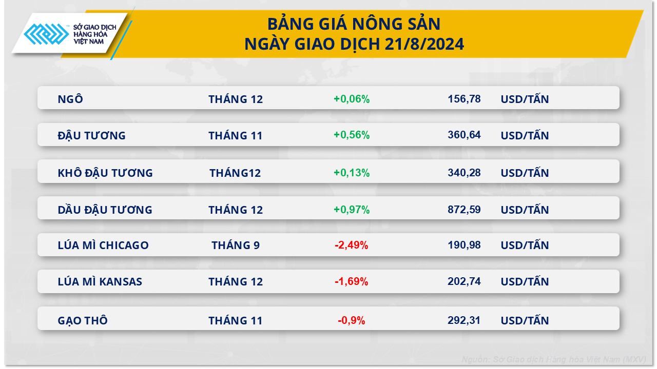 Trong khi đó, cuộc khảo sát mùa vụ Crop Tour 2024 tại khu vực Midwest của Mỹ đã kết thúc ngày thứ hai tại các bang Indiana và Nebraska với kết quả tích cực. Đoàn khảo sát ước tính năng suất ngô trung bình ở Indiana và Nebraska lần lượt ở các mức 187,54 và 173,25 giạ/mẫu, đều cao hơn so với kết quả năm ngoái cũng như mức trung bình 3 năm. Dữ liệu này phần nào củng cố thêm cho triển vọng về một vụ ngô bội thu tại Mỹ và đã gây áp lực lớn lên giá.