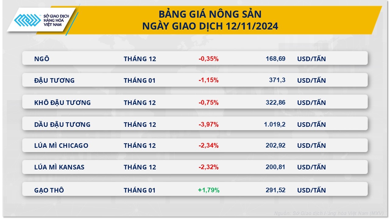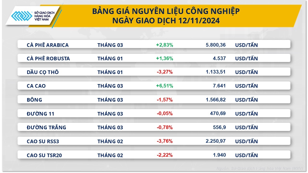 Trên thị trường nông sản, có đến 6 trên 7 mặt hàng chìm trong sắc đỏ, trong đó dầu đậu tương dẫn dắt đà giảm với gần 4%. Ở chiều hướng ngược lại, thị trường nguyên liệu công nghiệp ghi nhận diễn biến tích cực khi giá cà phê Arabica và Robusta duy trì đà tăng sang phiên thứ 4 liên tiếp, đưa giá hai mặt hàng này lên mức cao nhất trong vòng 6 tuần qua.
