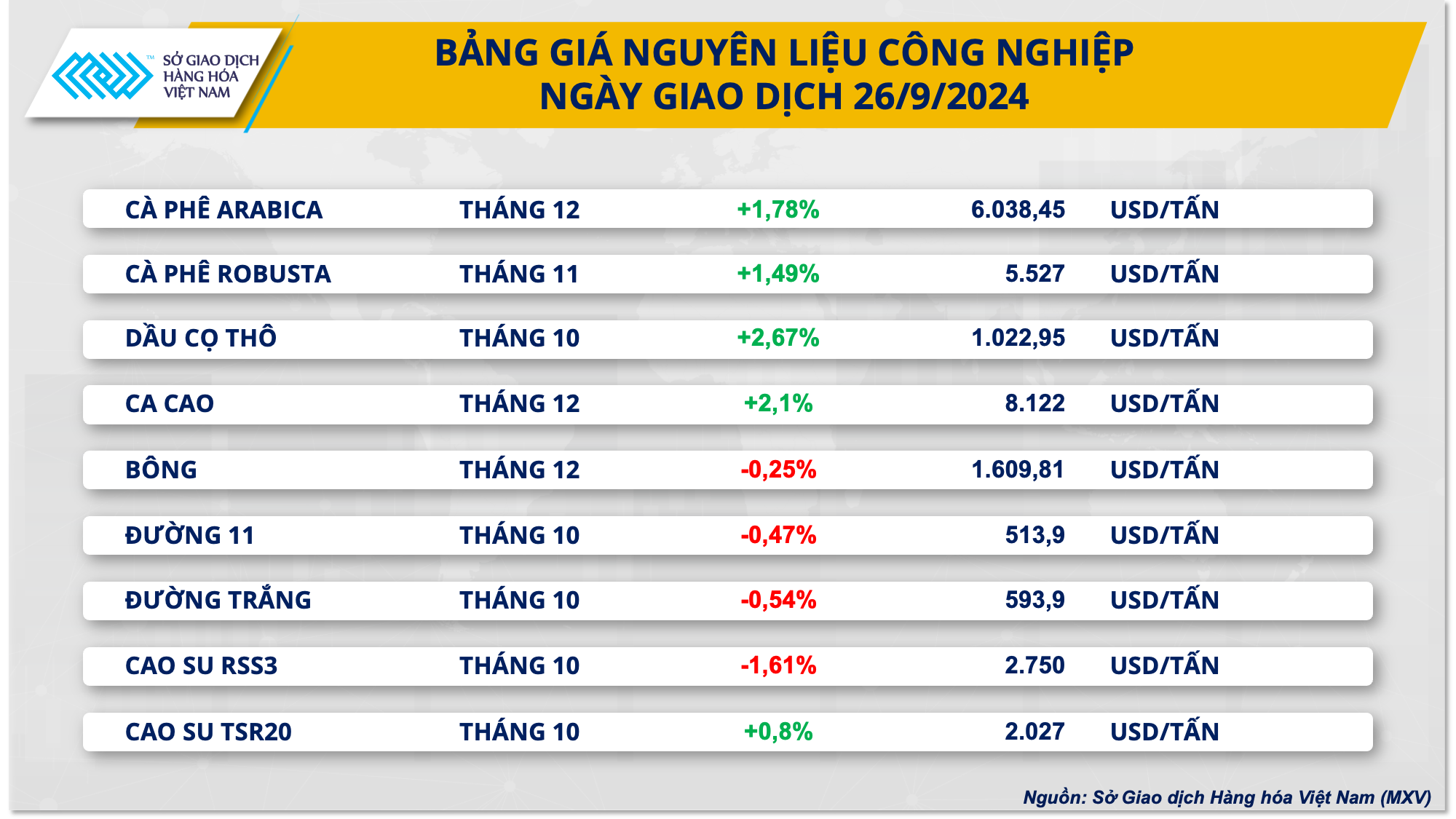 Đóng cửa, lực mua chiếm ưu thế kéo chỉ số MXV-Index tăng thêm 0,05% lên mức 2.203 điểm. Đáng chú ý, trên thị trường nguyên liệu công nghiệp, giá mặt hàng cà phê Arabica đã phá thủng mốc kỷ lục 6.000 USD/tấn trong bối cảnh triển vọng nguồn cung tại Brazil và Việt Nam kém tích cực. Trong khi đó, toàn bộ 5 mặt hàng nhóm năng lượng tiếp tục chìm trong sắc đỏ.