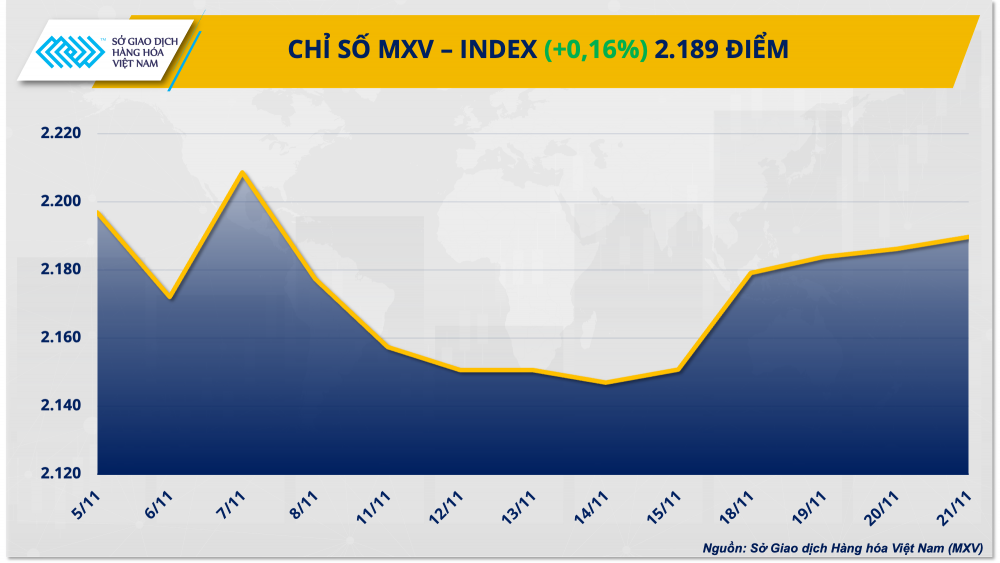 Đóng cửa, chỉ số MXV-Index tăng 0,16% lên 2.189 điểm, nối dài chuỗi tăng 5 phiên liên tiếp. Đáng chú ý, toàn bộ 5 mặt hàng nhóm năng lượng đồng loạt tăng giá trong bối cảnh căng thẳng địa chính trị thêm nhiều diễn biến phức tạp. Bên cạnh đó, trên thị trường nguyên liệu công nghiệp, giá hai mặt hàng cà phê diễn biến trái chiều.