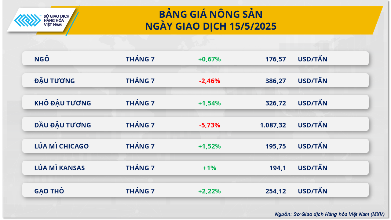 Ở chiều ngược lại, báo cáo của Hiệp hội Chế biến Hạt dầu Quốc gia Mỹ (NOPA) cho thấy khối lượng ép dầu đậu tương tháng 5 đạt 5,18 triệu tấn - mức cao kỷ lục mới theo tháng và vượt xa kỳ vọng, tăng 9% so với cùng kỳ năm ngoái. Tuy nhiên, tồn kho dầu đậu tương cũng tăng lên 0,71 triệu tấn, mức cao nhất trong 10 tháng, tạo thêm áp lực giảm giá.