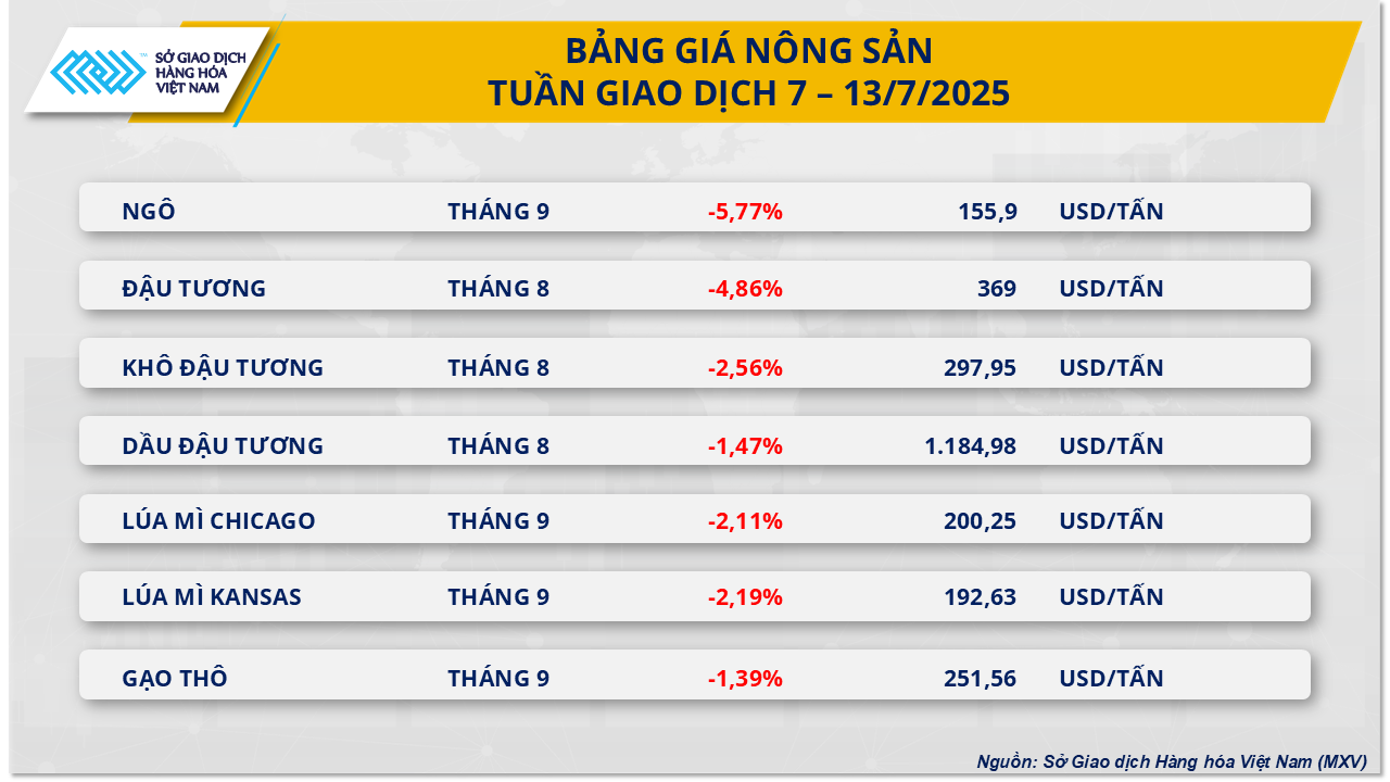 Tuy nhiên điều đáng lo ngại nhất là căng thẳng thuế quan chưa có dấu hiệu được cải thiện. Trong tuần, Mỹ đã tuyến bố áp thuế 50% đối với Brazil, khiến tỷ giá đồng Real Brazil và USD đã giảm 2 điểm phần trăm, khuyến khích các nhà sản xuất Brazil tăng bán nông sản ra. Thêm vào đó, tình hình thuế quan giữa Mỹ và Trung Quốc chưa được cải thiện, khiến các nhà đầu tư lo ngại về triển vọng kinh tế thế giới trong tương lai.Tin liên quan