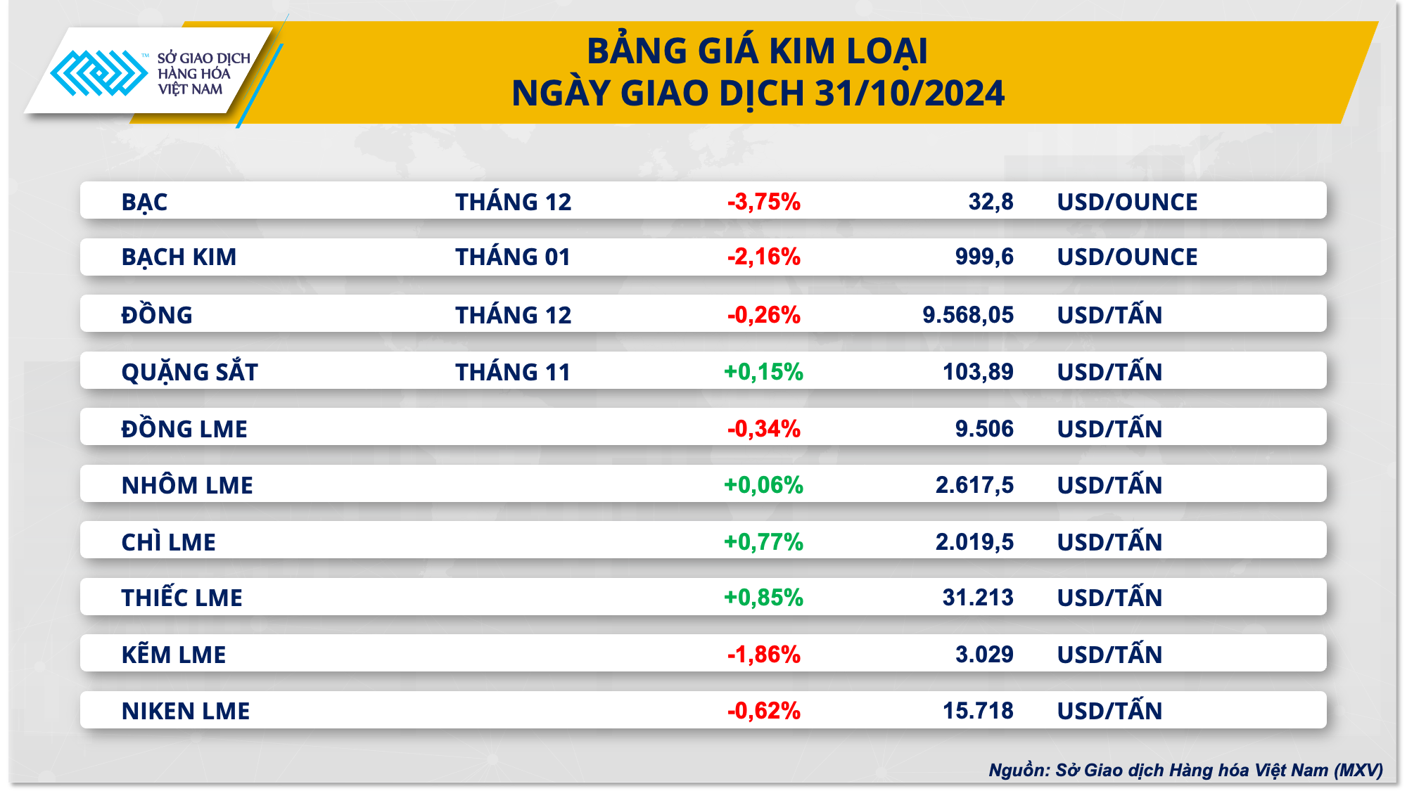 Đóng cửa phiên giao dịch hôm qua (31/10), thị trường kim loại diễn biến tương đối trái chiều. Đối với kim loại quý, giá bạc giảm 3,75% về 32,79 USD/oz, mức thấp nhất hai tuần. Đây cũng là phiên ghi nhận mức giảm theo ngày lớn nhất của giá bạc trong ba tuần gần đây. Giá bạch kim cũng đánh mất mốc 1.000 USD/oz sau khi giảm hơn 2%, chốt phiên tại mức 999,6 USD/oz, thấp nhất hai tuần.