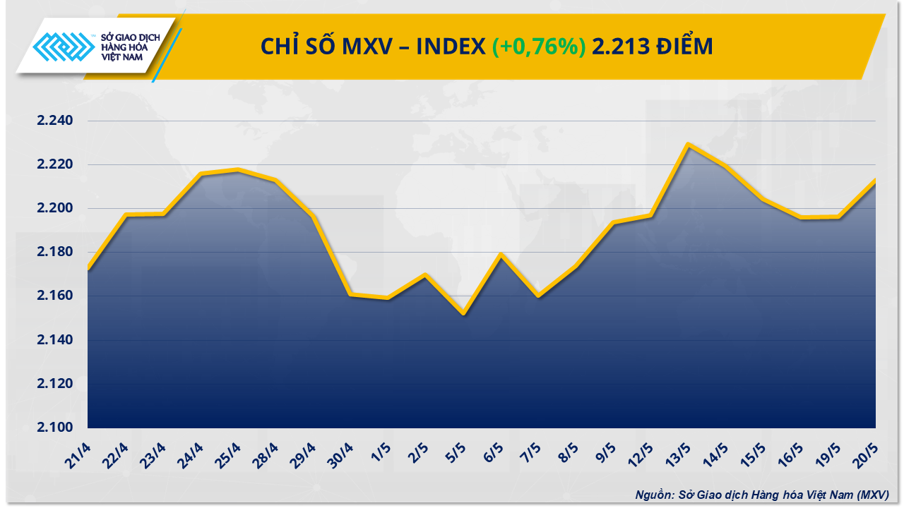 Trên thị trường nông sản, giá ngô ghi nhận phiên phục hồi thứ hai trước lo ngại về tình trạng mưa lớn kéo dài gây ảnh hưởng đến hoạt động gieo trồng. Trong khi đó, giá kim loại cơ bản như đồng, quặng sắt… tiếp tục được hỗ trợ do nhu cầu yếu. Đóng cửa phiên giao dịch hôm qua, lực mua chiếm ưu thế kéo chỉ số MXV-Index tăng 0,7% lên mức 2.213 điểm.